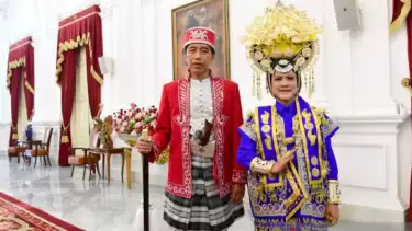 Sedangkan Presiden Jokowi yang mengenakan baju Dolomani dari Buton berbentuk jubah panjang warna merah dengan ornamen putih di sepanjang pinggiran jubah. Presiden juga mengenakan celana merah dengan ornamen putih senada.