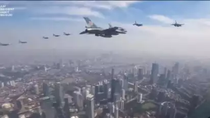 Jakarta - Atraksi pesawat tempur TNI Angkatan Udara atau "flypass" dan pengibaran bendera raksasa oleh Helikopter TNI AU dan Kepolisian RI mewarnai langit ibu kota untuk memeriahkan Peringatan HUT Ke-77 Republik Indonesia.