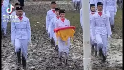 Momen Paskibra Kibarkan Bendera Merah Putih di Lapangan Penuh Lumpur Bikin Nitizen Terharu