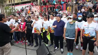 Jakarta - Dipimpin musisi kondang Dwiki Dharwaman, seluruh peserta jalan pagi Komengsong mengakhiri acara jalan pagi hari Minggu (21/8) dengan menyanyikan lagu kebangsaan “Indonesia Raya” dan “Padamu Negeri”. Ide menyanyi dicetuskan spontan oleh Menteri Perhubungan Budi Karya Sumadi, penggagas acara jalan pagi.