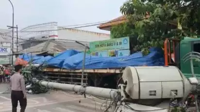 Menurut saksi mata, tiang yang berada tepat di depan SD Kota Baru, Bekasi tersebut roboh akibat ditabrak truk yang tengah melaju di jalan tersebut.