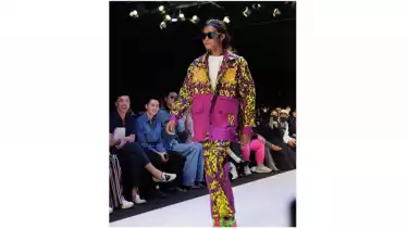 Saat berjalan di runway, Bonge memakai outfit bergaya urban dengan oversized jacket berwarna kuning ungu, dengan pattern yang sangat statement. Ini dipadukan dengan loose pants warna ungu yang memang satu set dengan jaketnya. Selanjutnya, rambutnya di kuncir agar terkesan lebih keren. Bonge menambahkan kacamata hitam bergaya metropolitan.