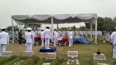 Sidoarjo, Jawa Timur - Dua penerbang pesawat latih TNI Angkatan Laut jenis Bonanza G-36 T-2503 yang jatuh di Selat Madura dimakamkan berdampingan di Makam Bahagia TNI AL Wilayah Timur, Desa Gisik Cemandi, Kecamatan Sedati, Jumat (9/9/2022).