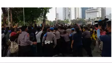 Jakarta - Aksi demo yang digelar oleh Aliansi Badan Eksekutif Mahasiswa Seluruh Indonesia (BEM SI) untuk menolak kenaikan harga Bahan Bakar Minyak di kawasan seputaran Patung Kuda Arjuna Wijaya mulai memanas. Sejumlah mahasiswa yang berada paling depan, menjebol kawat berduri yang dipasang aparat kepolisian sebagai pembatas.