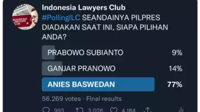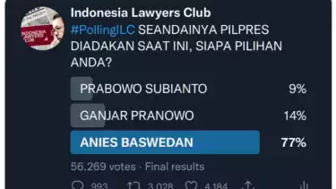 Jakarta - Indonesia Lawyer Club menggelar voting kepada netizen pengguna twitter mengenai "Seandainya Pemilu Presiden Digelar Hari ini". Hasil dari voting, mayoritas netizen pengguna twitter mengunggulkan Anies Baswedan dengan perolehan suara mencapai 77 persen.
