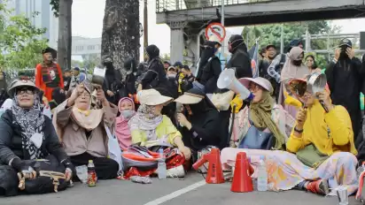 Unik, Ibu-ibu Bawa Panci Saat Demo Kenaikan Harga BBM di Patung Kuda Jakarta Pusat