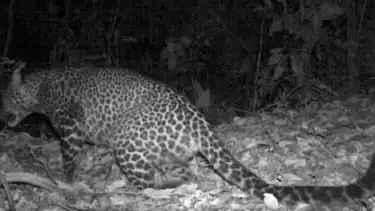 Karawang, Jawa Barat - Satu macan tutul jawa terekam kamera jebak yang dipasang oleh tim Sanggabuana Wildlife Expedition di kawasan hutan Gunung Sanggabuana, Kabupaten Karawang, Jawa Barat.