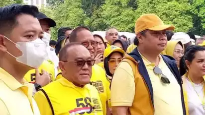Jakarta - Ratusan simpatisan dan kader Partai Golkar memenuhi Plaza Tenggara, Gelora Bung Karno, Jakarta, Minggu pagi, 16 Oktober 2022. Mereka datang untuk melakukan jalan sehat bersama sebagai rangkaian HUT ke-58 Partai Golkar.