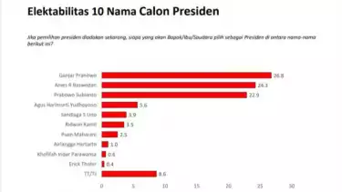 "Pada simulasi 10 nama, Ganjar Pranowo mendapatkan elektabilitas tertinggi, unggul tipis di atas Anies Baswedan (24,3 persen) dan Prabowo Subianto (22,9 persen). Nama-nama lainnya berada di bawah 6 persen dan responden yang tidak menjawab atau tidak tahu sebesar 8,6 persen," jelas dia.