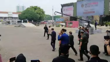Berdasarkan pantauan, Presiden Jokowi tiba di JIExpo sekitar pukul 09.03 WIB dengan mengenakan setelan jas berwarna biru tua.