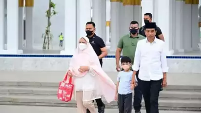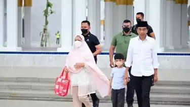 Jakarta - Presiden Joko Widodo (Jokowi) dan Ibu Negara Iriana Joko Widodo (Jokowi) mengajak cucu pertamanya, Jan Ethes, salat duha di Masjid Raya Sheikh Zayed Surakarta, Jawa Tengah, Minggu (20/11/2022).