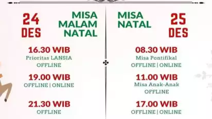 Pastor Kepala Katedral Romo Hani Rudi Hartoko di Jakarta menyebutkan Misa Malam Natal (24/12/2022) dibagi ke dalam tiga sesi, pertama pukul 16.30 WIB yang dikhususkan bagi lansia dan digelar secara luring, lalu pukul 19.00 WIB (luring dan daring), dan pukul 21.30 WIB (luring).
