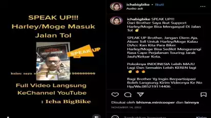 Tak hanya itu saja, medis sosial instagram itu menerangak soal peratauran kendaraan roda dua, termasuk moge dilarang melintas di jalan tol. Hal ini berdasarkan Pasal 38 Peraturan Pemerintah Nomor 15 Tahun 2005 tentang Jalan Tol.