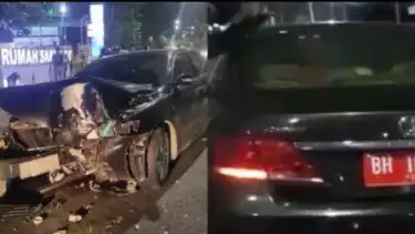 Sedan Toyota Camry berplat merah dengan nomor polisi BH 1842 Z milik Sekretariat DPRD Jambi yang mengalami kecelakaan tunggal di Jalan Soekarno Hatta, Kota Jambi pada Kamis (2/2/2023) malam.
