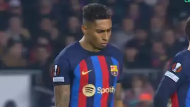 Ketika hendak duduk di bangku pemain, Raphinha secara spontan menendang beberapa kali bangku yang ada di hadapannya. Jordi Alba pun nampak panik dengan sikap rekannya.Â