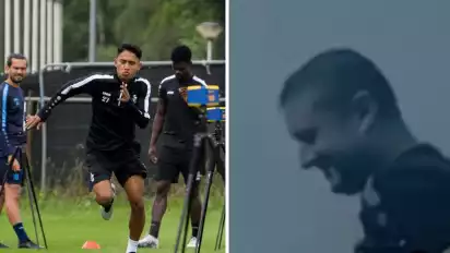 Bukan cuma itu bahkan aksi Marselino juga buat asisten pelatih K.M.S.K Deinze tersenyum dengan kelakuan iseng Marselino Ferdinan.