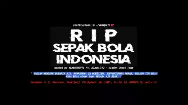 Peretas menuliskan "RIP Sepak Bola Indonesia" dengan ukuran yang besar berwarna putih.