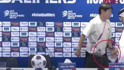 Usai konferensi pers berlangsung, Shin Tae-yong langsung berdiri dan meninggalkan ruangan.