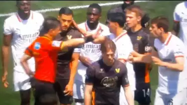 Wasit yang melihat hal tersebut pun kemudian dikerubungi oleh pemain dari kedua tim.
