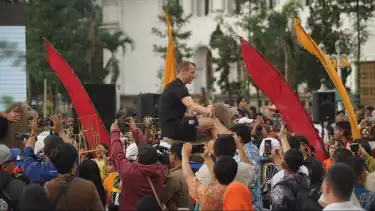 Konferensi pers Piala Presiden yang berlangsung di Gedung Sate, Kota Bandung, Jumat (11/7/2025) diwarnai oleh aksi budaya Sunda, Sisingaan dan Angklung.