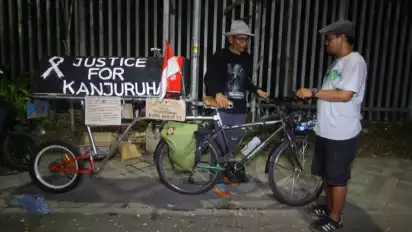 Sesuai rencana, Midun mengayuh sepeda berhias keranda mayat bertuliskan "Justice for Kanjuruhan" hingga Jakarta.