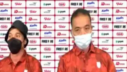 Pelatih Persis Solo Eko Purdjianto (kanan) didampingi pemain belakang Persis Solo Rian Miziar (kiri) dalam Konferensi Pers virtual.