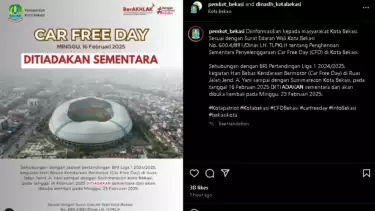 "Sehubungan dengan BRI Pertandingan Liga 1 2024/2025, kegiatan Hari Bebas Kendaraan Bermotor (Car Free Day) di Ruas Jalan Jend. A. Yani sampai dengan Summarecon Kota Bekasi, pada tanggal 16 Februari 2025 ditiadakan sementara dan akan dibuka kembali pada Minggu, 23 Februari 2025," tulis akun resmi Pemkot Bekasi di Instagram, dikutip Jumat (14/2).