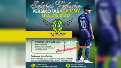 Tasikmalaya, tvOnenews.com - Persikotas FC Academy akan menggelar seleksi terbuka bagi pemain muda kelompok usia U-13, U-15, dan U-17 pada 22–23 Februari 2025 di Lapangan Indosoccernesia Siloka, Jalan Letnan Harun, Kecamatan Indihiang, Kota Tasikmalaya.