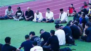 Doa bersama digelar selepas sesi latihan sore Arema FC. Para pemain—termasuk pemain asing seperti kiper Lucas Frigeri dan bek Thales Lira—tampak larut dalam prosesi penuh khidmat tersebut.