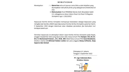"Keputusan Komite Ad-Hoc Kompetisi mempunyai kedudukan sebagai keputusan yang mengikat dan berlaku efektif sejak diputuskan Komite Ad-Hoc Kompetisi, pada hari Senin, 5 September 2022 dengan ketentuan akan diadakan perubahan jika kemudian hari terdapat kekeliruan," bunyi akhir surat tersebut yang ditandatangani langsung oleh Dirut LIB, Akhmad Hadian Lukita.
