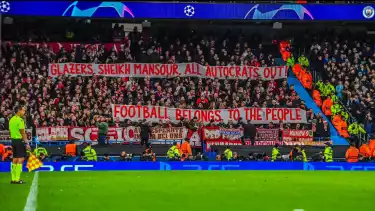 "Glazers, Sheikh Mansour, semua autokrat keluar! Sepak bola adalah milik rakyat," begitu tulisan spanduk yang dibentangkan suporter Munchen.