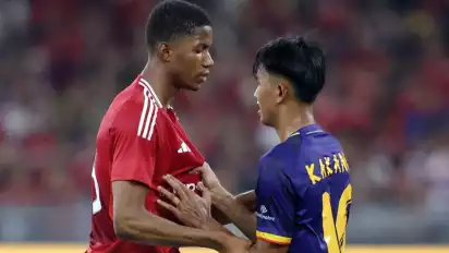 Salah satunya winger muda Amad Diallo yang tertangkap kamera mengacungkan jari tengah ke arah kerumunan penggemar di depan hotel tim di Kuala Lumpur, Malaysia.