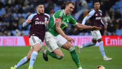 Situasi berubah menjelang akhir babak pertama setelah kiper Villa, Marco Bizot, diganjar kartu merah akibat pelanggaran keras di luar kotak penalti.