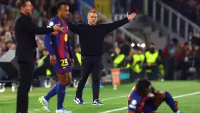 Pelatih Barcelona, Hansi Flick, terlihat geram di pinggir lapangan. Namun dia bergerak untuk menghentikan para pemainnya melakukan protes keras kepada sang wasit asal Rumania setelah laga usai.