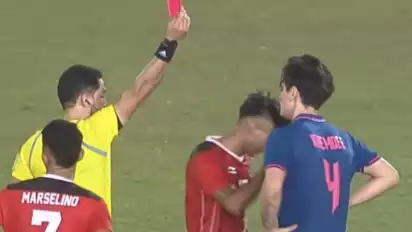 Wasit sampai harus menghentikan pertandingan dan 'mengusir' pihak yang terlibat dengan memberikan kartu merah pada staf pelatih Thailand.