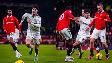 Pascal Struijk saat bermain melawan Manchester United, tampak berduel dengan Rashford.