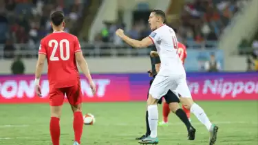 Pada sebuah momen di sisi kanan lapangan Pham Xuan Manh terlihat mendapat tekel keras dari Struick hingga terjatuh.