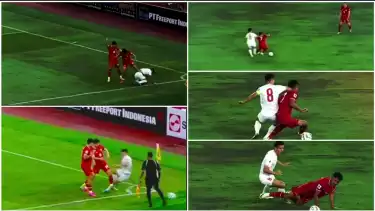 Mencoba bangun dan menguasai bola kembali, Pham Xuan Manh terkejut dengan Natahan Tjoe-A-On yang tiba-tiba datang dan melakukan tekel padanya hingga terpental.