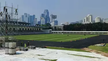 Kemudian, sebagian lapangan Stadion Madya juga terlihat masih tertutupi dengan kain hitam dan nampak beberapa pekerjaan sedang memangkas rumput lapangan.