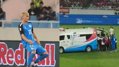 Adrian Ugelvik dibawa mobil ambulans saat laga kontra Indonesia di SUGBK. Sumber: Instagram @adrianugelvik - tvOnenews.com/Ilham Giovani
