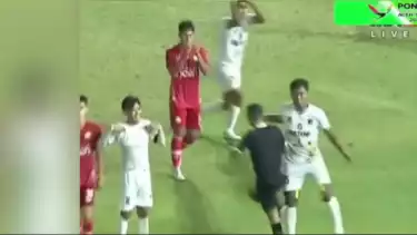 Geram dengan keputusan kontroversial wasit, pemain Sulawesi Tengah Muhammad Rizki Saputra memukul kepala Eko Agus.