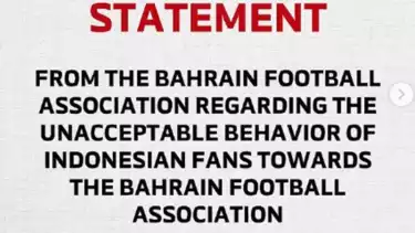 Asosiasi Sepak Bola Bahrain telah memantau dalam beberapa hari terakhir soal sikap yang tak bisa diterima dan tak bertanggung jawab dari fans Timnas Indonesia terhadap Asosiasi Sepak Bola Bahrain dan para pemain tim nasional kami menyusul pertandingan Bahrain melawan Timnas Indonesia di putaran ketiga kualifikasi Piala Dunia 2026 AFC.