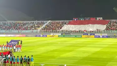 Sidoarjo, tvOnenews.com - Sebuah bendera merah putih raksasa terbentang di laga Timnas Indonesia U-23 vs Makau di Stadion Gelora Delta, Sidoarjo, Sabtu (6/9/2025) malam WIB.