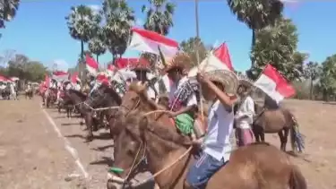 Cara unik yang dilakukan rakyat Dusun Oe-milan, Desa Oe-tutulu Rote Barat Laut, Kabupaten Rote Ndau Nusa Tenggara Timur dalam rayakan upacara HUT ke-78 RI, dengan berkuda dan berpakaian adat, pada hari Kamis (17/8/2023).Â