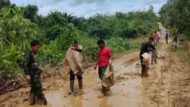 Jakarta - Prajurit TNI Satgas Pengamanan perbatasan RI-Malaysia Yonarmed 19/105 Trk Bogani bersama masyarakat gotong royong memperbaiki jalan rusak di Desa Nanga Bayan Kecamatan Ketungau Hulu daerah perbatasan Indonesia-Malaysia, wilayah Sintang Kalimantan Barat.