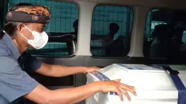 Peti jenazah Ni Wayan Supini ditandu oleh petugas TNI Polri tiba di Terminal Cargo dan Pos Domestik, dan dimasukkan ke dalam mobil ambulans milik Rumah Sakit Bhayangkara Denpasar yang langsung membawa jenazah ke kampung halamannya di Klungkung.