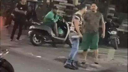 Lalu, terlihat seorang warga asing lainnya menggunakan kaus berwarna hitam dengan celana pendek menunjuk bule yang membawa pisau itu seakan-akan menantang bule yang menggenggam pisau itu.