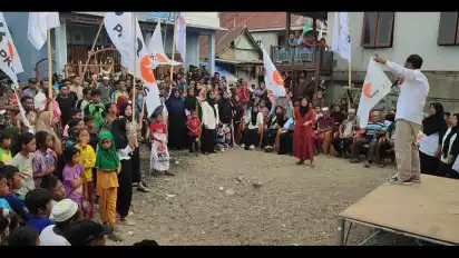 Orang tua dan anak-anak berbaur memegang atribut partai sambil mengikuti kampanye yang dilakukan oleh Partai PKS di sikka, Rabu (29/11/2023).