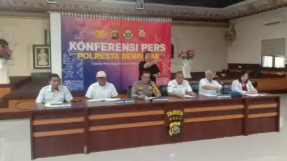 Denpasar, tvOnenews.com - Polresta Denpasar menggelar konferensi pers terkait penyebab tewasnya seorang mahasiswa asal Medan, Sumatera Utara, Aldi Sahilatua Nababan (23) di kamar indekosnya di Jalan Bypass Ngurah Rai, Kuta Selatan, Kabupaten Badung, Bali.