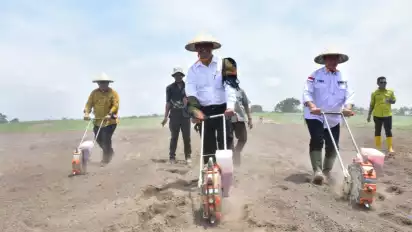 Sumbawa, tvOnenews.com - Menteri Pertanian (Mentan) RI, Andi Amran Sulaiman, melakukan penanaman jagung di Kawasan Samota, Kelurahan Brang Biji, Kabupaten Sumbawa, NTB, guna memacu budidaya di semua daerah sehingga di tahun 2024 terjadi peningkatan produksi jagung nasional, Kamis 25 Januari 2024.